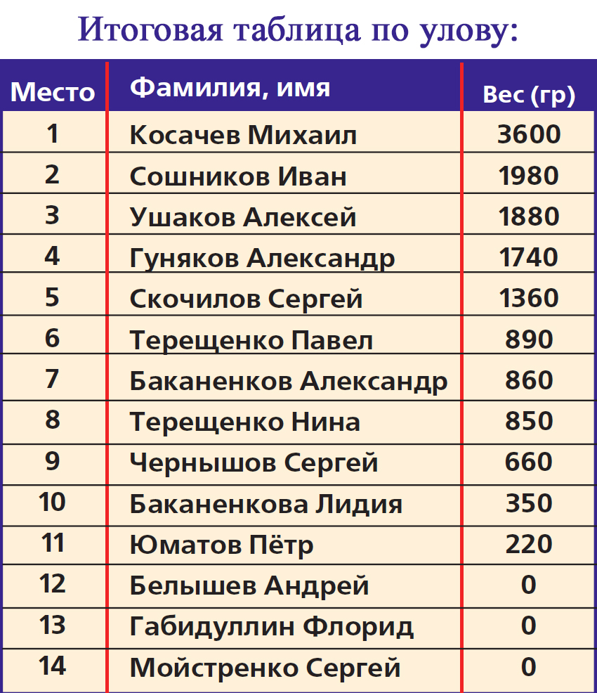 Сенсации не произошло. Прошлогодний победитель Михаил Косачев не дал себя догнать никому, поймав 3600 гр., он далеко обошёл Ивана Сошникова (1980 гр.), занявшего второе место и Алексея Ушакова (1880 гр.) ставшего третьим.